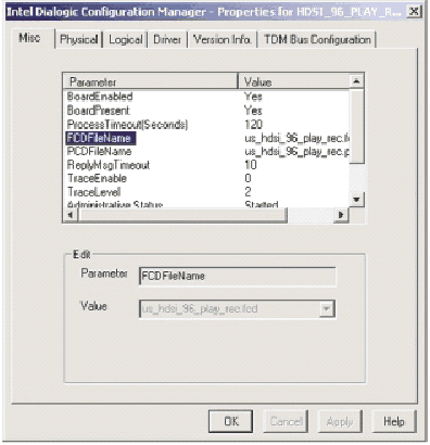 當(dāng)一個(gè)config文件被修改時(shí),<INSTALL DIRECTORY>\Dialogic\Bin\fcdgen 工具必須用修改過(guò)的或者新的config文件的位置和名字執(zhí)行。這個(gè)工具會(huì)創(chuàng)建一個(gè)新的FCD文件,該文件必須在配置管理列表中相應(yīng)板卡的FCD文件Name域上詳細(xì)說(shuō)明.例見(jiàn)圖2.